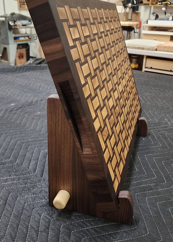 Walnut with loose Maple dowel. For displaying your cutting board.